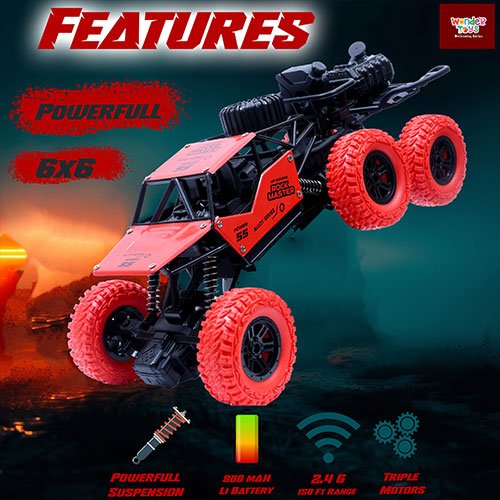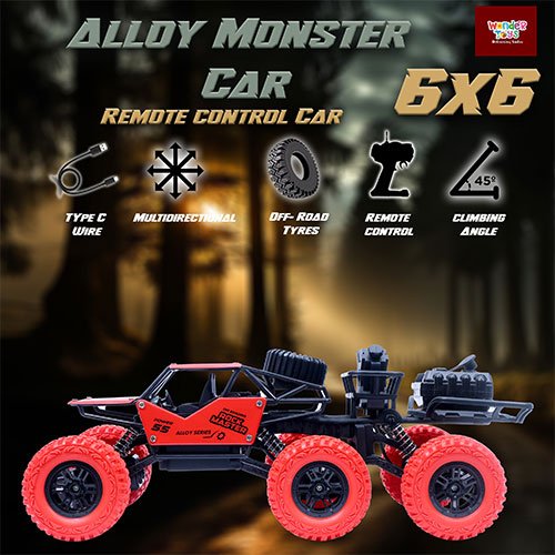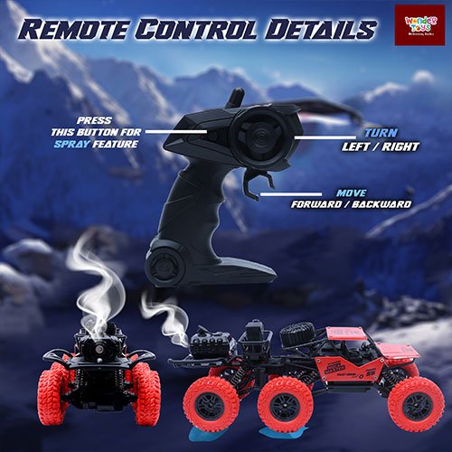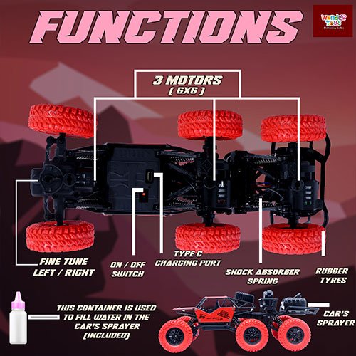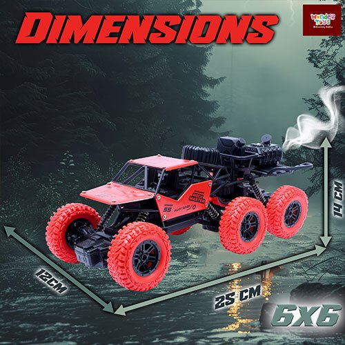 Experience the thrill of off-road adventures right at home with the Monster Car Toy (Red) With Smoke Spray from Wonder Toys. Built with a robust alloy 6x6 chassis, this rock crawler is engineered for durability, stability, and maximum fun on any terrain. Equipped with Type-C fast charging, it ensures longer playtime with minimal downtime, keeping the action going. With 5 dynamic functions, including forward/reverse motion, smoke spray, LED lights, and high-speed crawling, this toy offers an immersive, realistic driving experience for kids and hobbyists alike. Its sleek red design and sturdy alloy body make it not just a toy, but a collectible that stands out on any shelf.