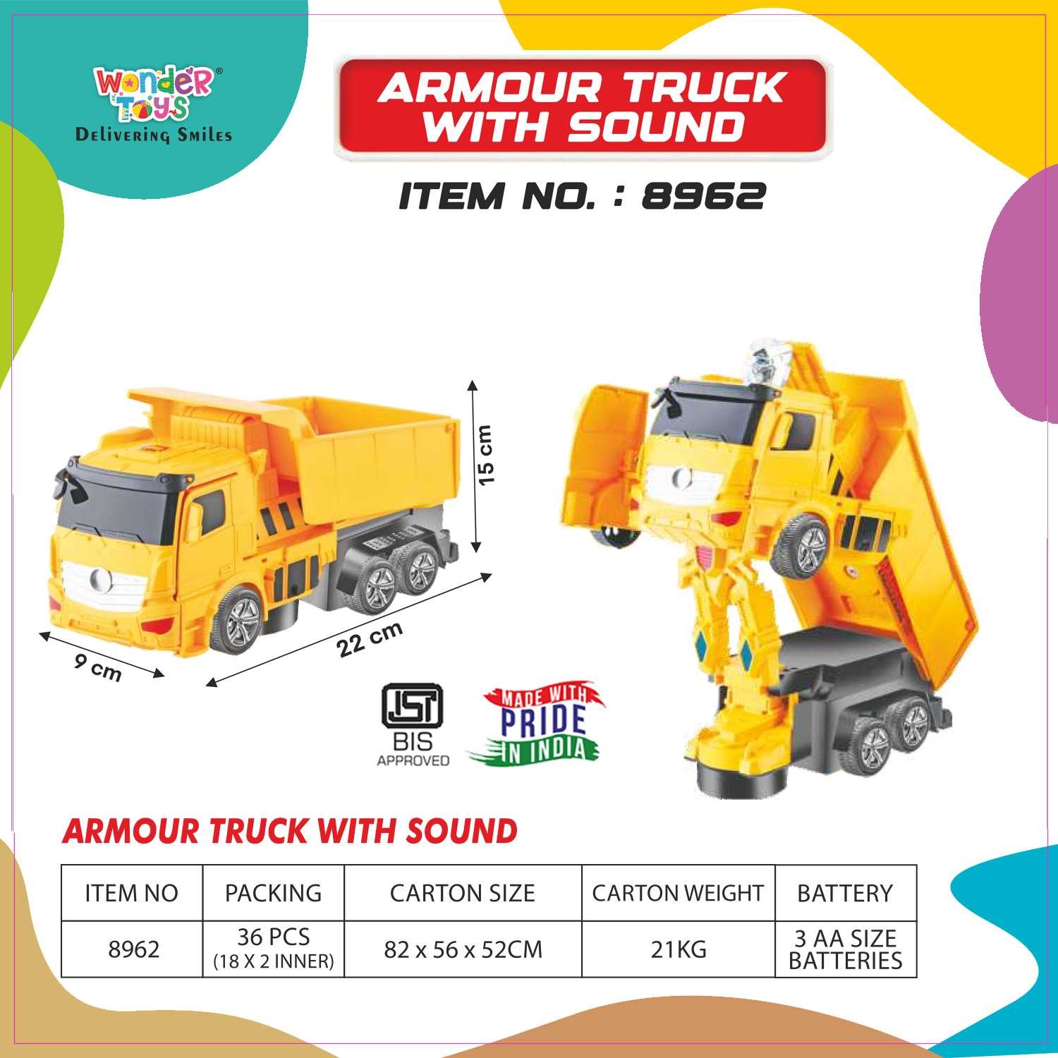 Armour Truck With Sound – Dump Toy Truck For Kids - Wonder Toys - 8962