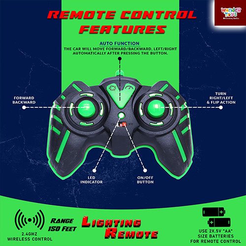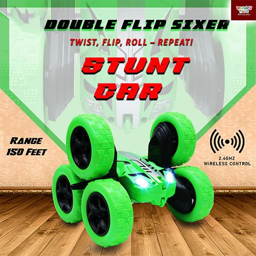 - 6-wheel double flip stunt car performs 360° flips, spins & rolls on both sides for non-stop action, Simple remote control with forward, backward, left, right & flip actions