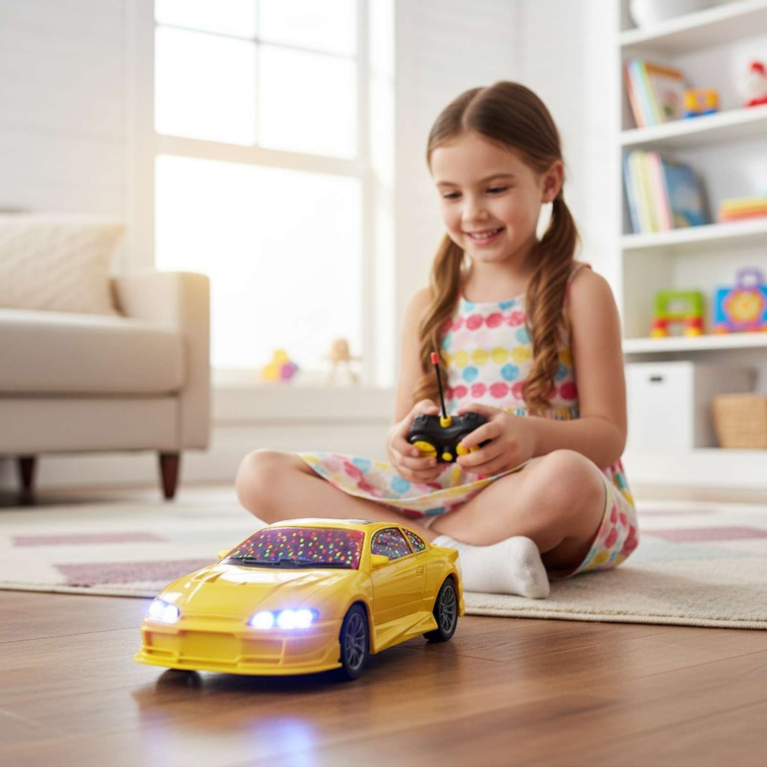 - Lights & Speed Combo: Featuring vibrant 3D LED lights and high speed, this rechargeable RC car turns every room into a race track party – perfect for indoor play!
