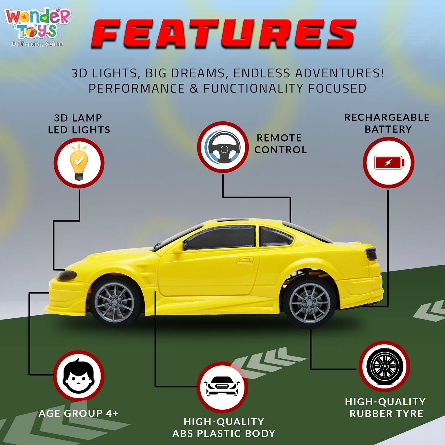 - Stylish RC Autofunction Car: The Wonder Dream 4 car is designed for non-stop fun! With auto-forward/backward and left/right motion at the press of a button, it ensures exciting racing play every time.
