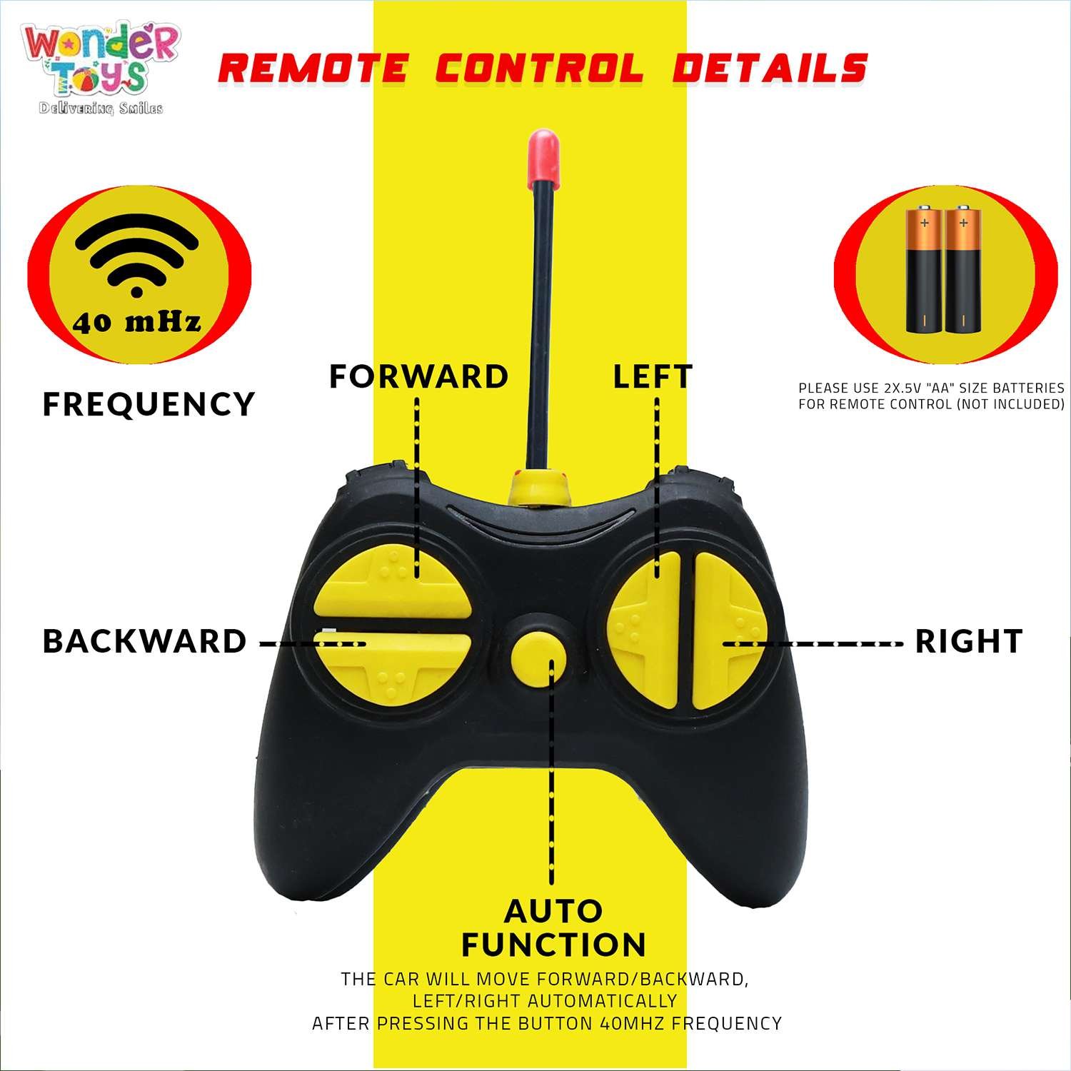 - 🎮 Easy-to-Use Remote Control: Operates on 40 MHz frequency and includes a simple controller with intuitive forward, backward, left, and right buttons. Requires 2x AA batteries (not included).