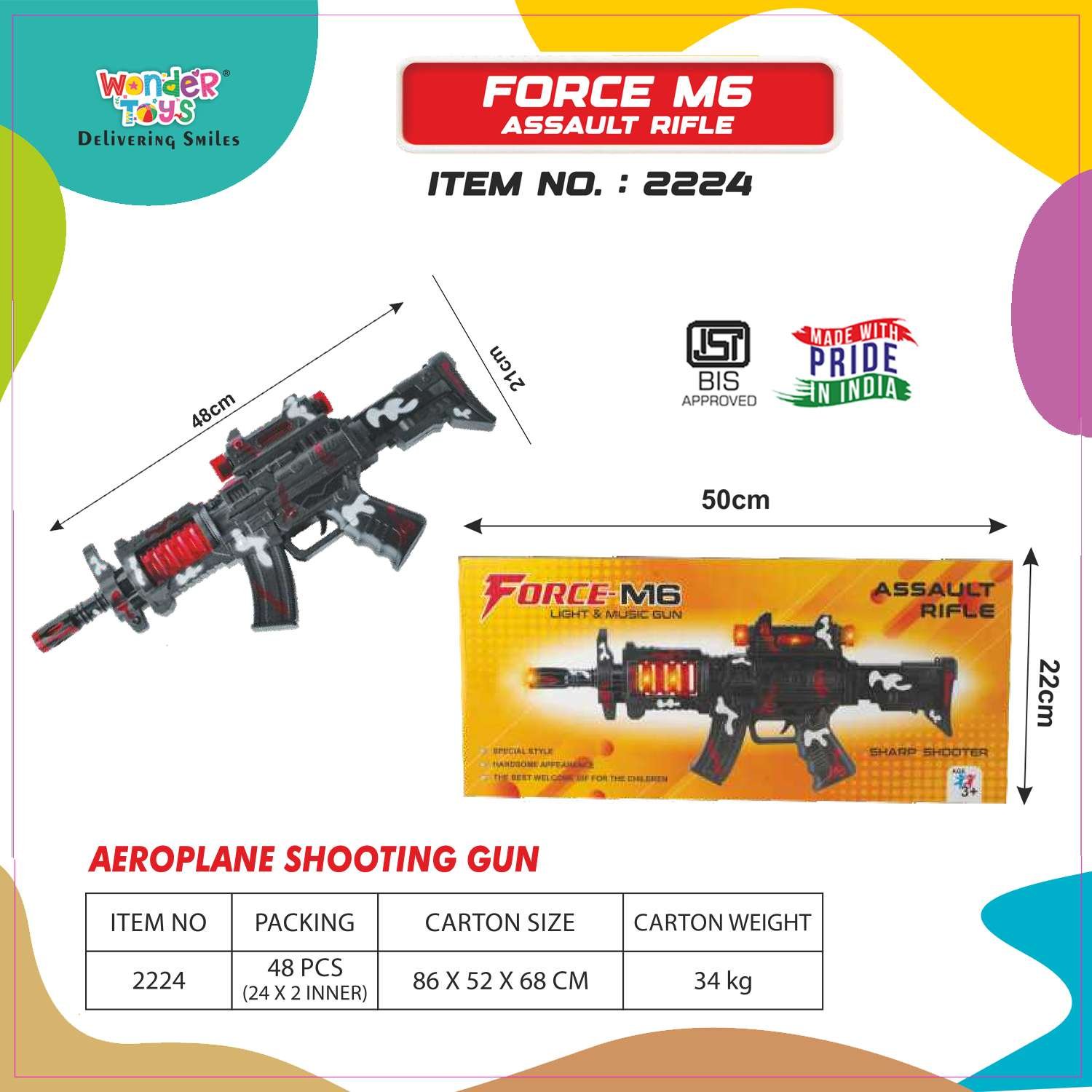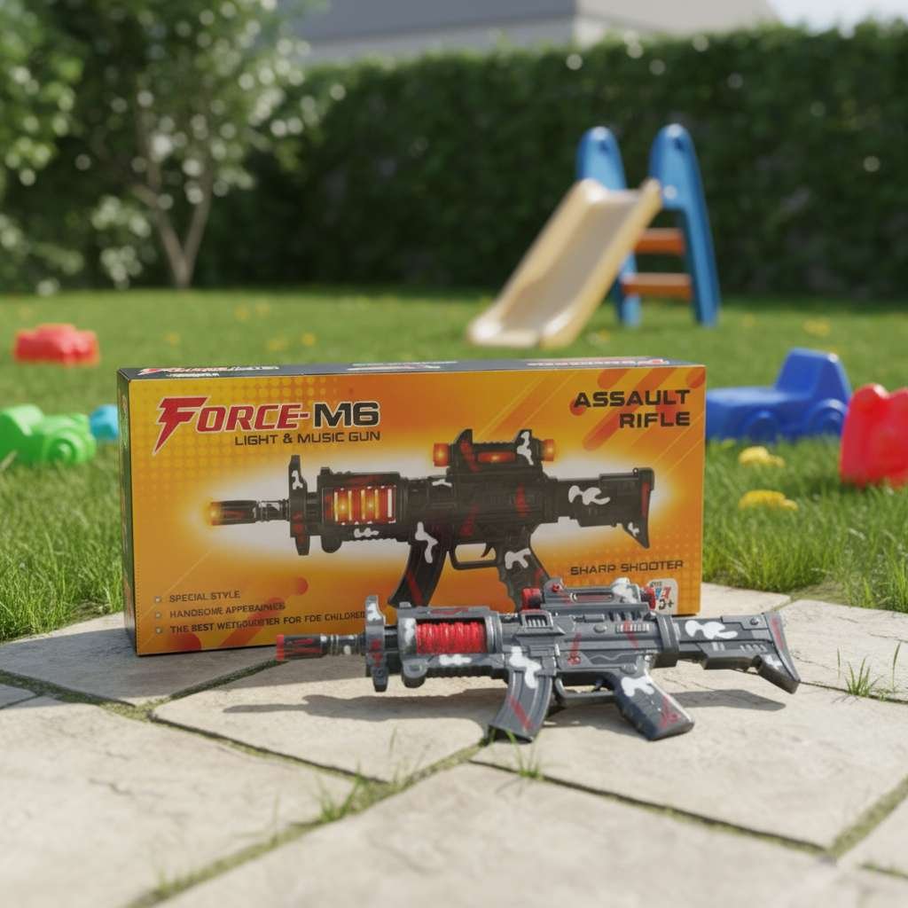 The M6-Style Foam Dart Blaster from Wonder Toys is a safe, action-packed toy built for active outdoor fun. Styled to be clearly a toy with bright safety colors and toy markings, this pump-action blaster fires soft foam darts with rounded tips — perfect for backyard battles, target practice, and group play. The blaster comes with an ergonomic grip, easy-to-use pump mechanism, a removable dart magazine, and 12 soft foam darts. Made from BPA-free, non-toxic plastic and soft foam, the toy is suitable for kids aged 6 and above. All packaging and product labels emphasize that this is a non-lethal toy. Ideal for birthday gifts, school parties, and family playtime, the M6-Style Foam Dart Blaster encourages coordination, social play, and active movement.