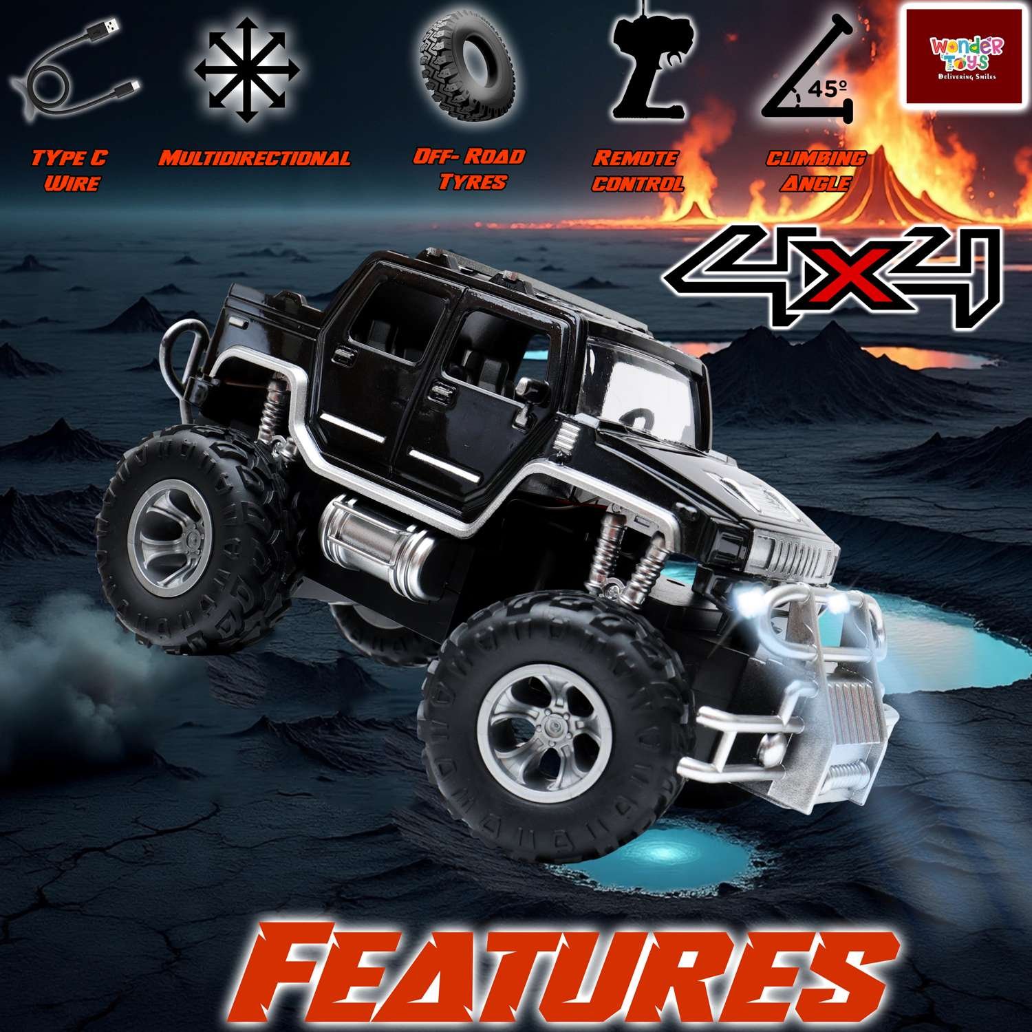 - 4x4 Off-Road Power – Strong motor, shock-absorbing suspension & 45° climbing angle for sand, rock, mud & grass.