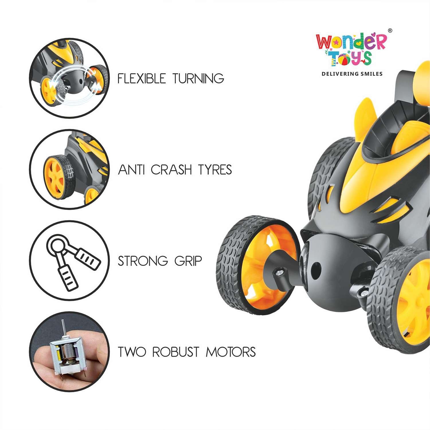 Parents trust Wonder Toys for delivering high-quality, safe, and engaging toys that keep children entertained. Ideal for birthdays, holidays, or any special occasion, the Mini Stunt Car Yellow 5 Functions Stunt Remote Car is a perfect gift for young RC enthusiasts. Its combination of compact size, responsive controls, and durable design makes it an exciting and reliable choice for children who love high-speed adventures and stunt-filled play.