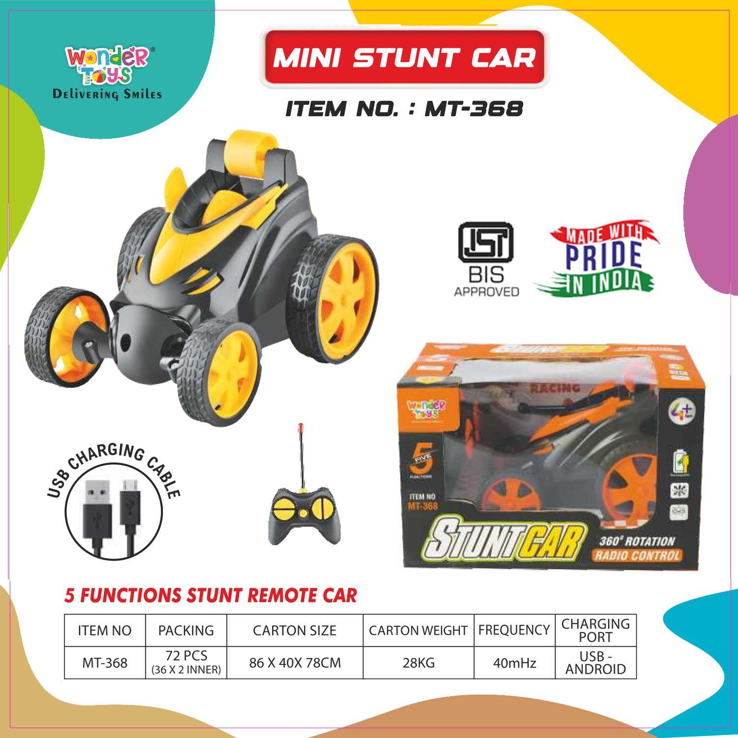 The Mini Stunt Car Yellow 5 Functions Stunt Remote Car by Wonder Toys is an action-packed RC car that combines compact design, durability, and exciting features. This miniature car offers a 5-function remote control system that allows children to drive forward, backward, turn left, turn right, and stop, making it perfect for performing stunts, spins, and tricky maneuvers.