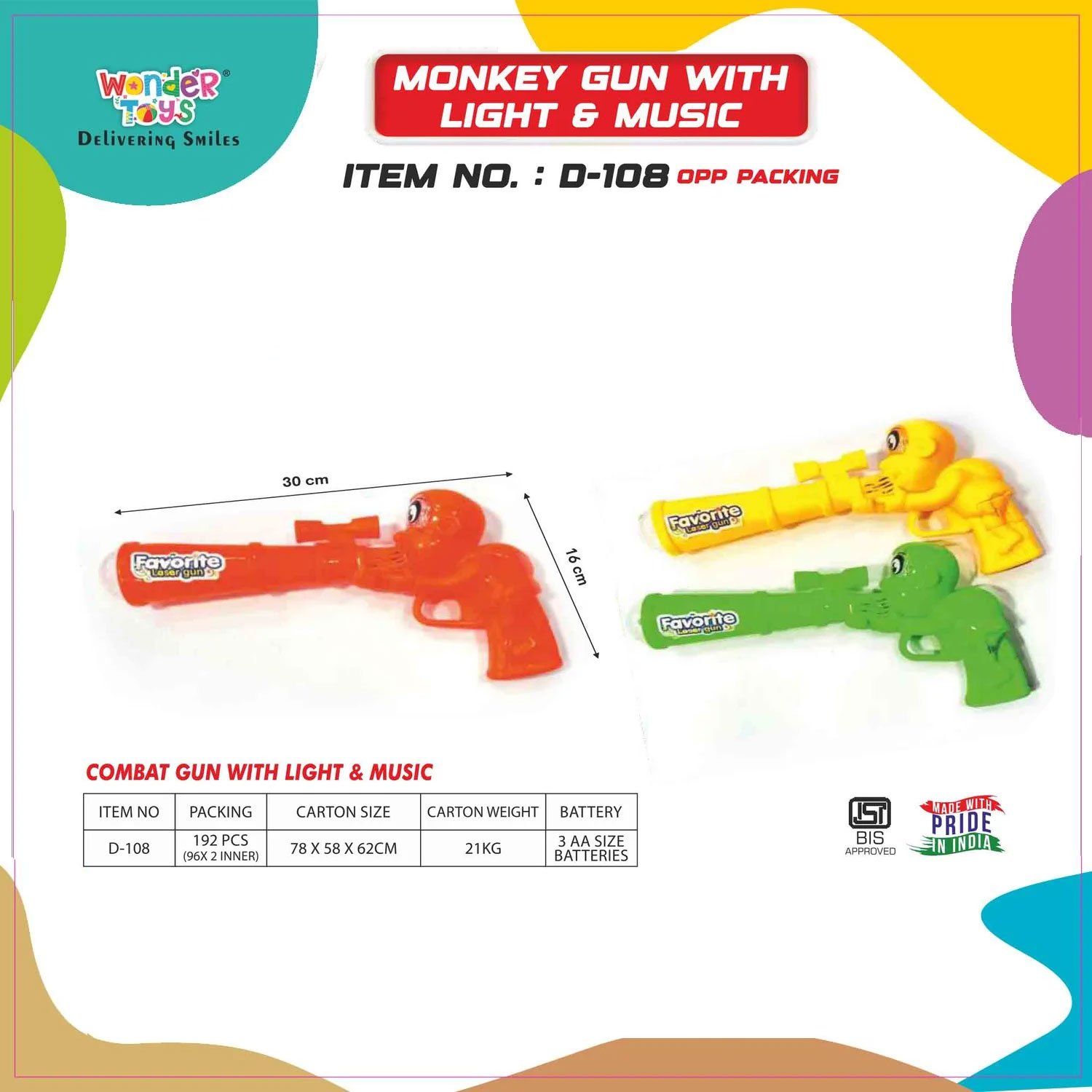 Delivered on 14 February at .Shop the best Laser Light Toy Gun for kids! Order now for safe, exciting playtime. Buy today and make your child’s playtime unforgettable. Bring endless fun and excitement to your child’s playtime with the Monkey Gun with Light & Music from Wonder Toys. This toy is designed to provide an interactive and thrilling experience with colorful LED lights, lively music, and realistic sound effects. Crafted from high-quality, non-toxic plastic, it ensures both safety and durability, making it perfect for everyday play.