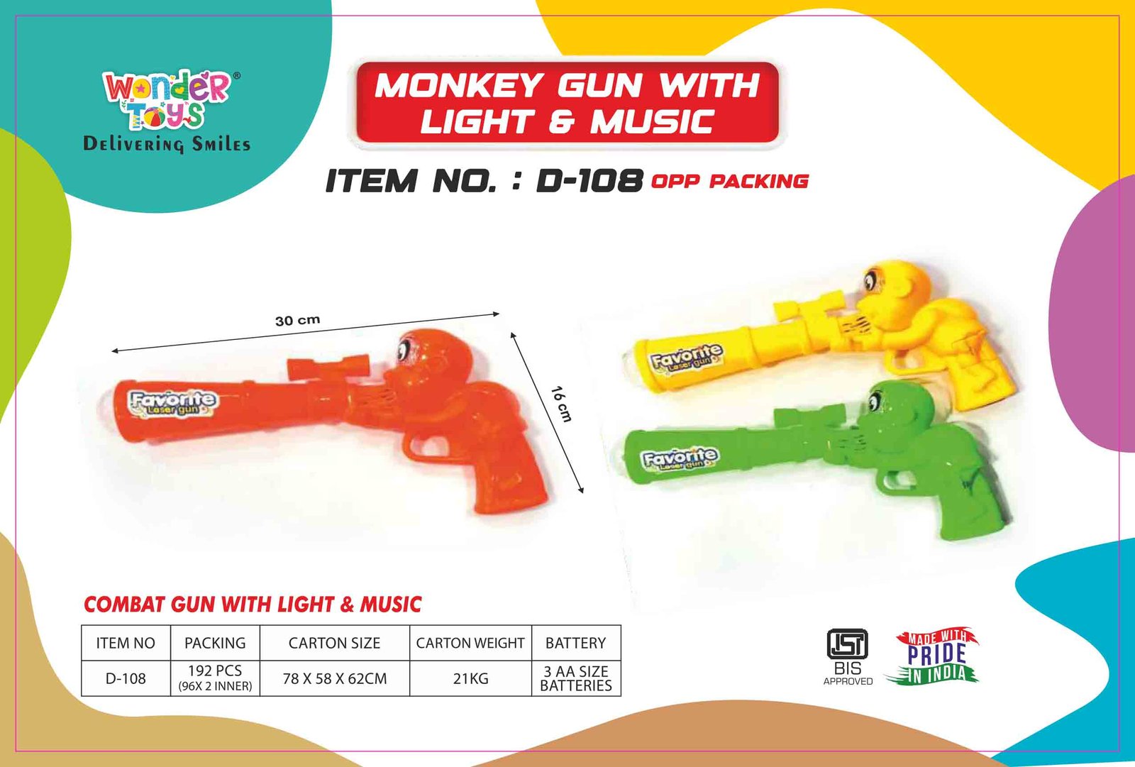 Parents trust Wonder Toys for delivering safe, fun, and high-quality toys. The rechargeable battery ensures continuous play without interruptions, making it ideal for birthdays, festivals, or casual fun. With its appealing design and interactive features, the Monkey Gun with Light & Music is a must-have toy for young adventurers, providing both entertainment and a chance to explore creative storytelling through play.