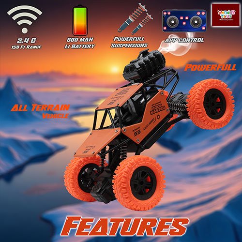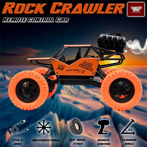 Experience the excitement of off-road racing like never before with Wonder Toys’ Rechargeable Rock Crawler Car, designed for kids who love speed, adventure, and real action! Built with a strong alloy frame, 4-wheel suspension, and shock-absorbing tires, this RC car conquers any terrain—rocks, sand, or grass—with ease. Its Type-C fast charging and rechargeable battery ensure uninterrupted fun, while the smoke spray feature adds a lifelike thrill to every race. The bold orange design and LED lights enhance its rugged look, making it the perfect combination of style, durability, and performance.