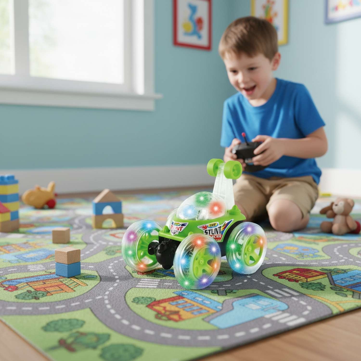 - 360° Flipping &360° Rotating R/C Stunt Car: Double sides running, moving forward, backward, turning left, right, 360 degree tumbling flip for different playing experience on this electric remote control stunt car. You can control the RC cars for kids in any direction with its remote controller. This remote control car can race, and, perform double-sided driving, 360° spins and flip with its LED dazzling headlights. Spinning: Perform incredible stunts with ease! The stunt car can flip, spin, and roll in all directions, providing endless entertainment and excitement.