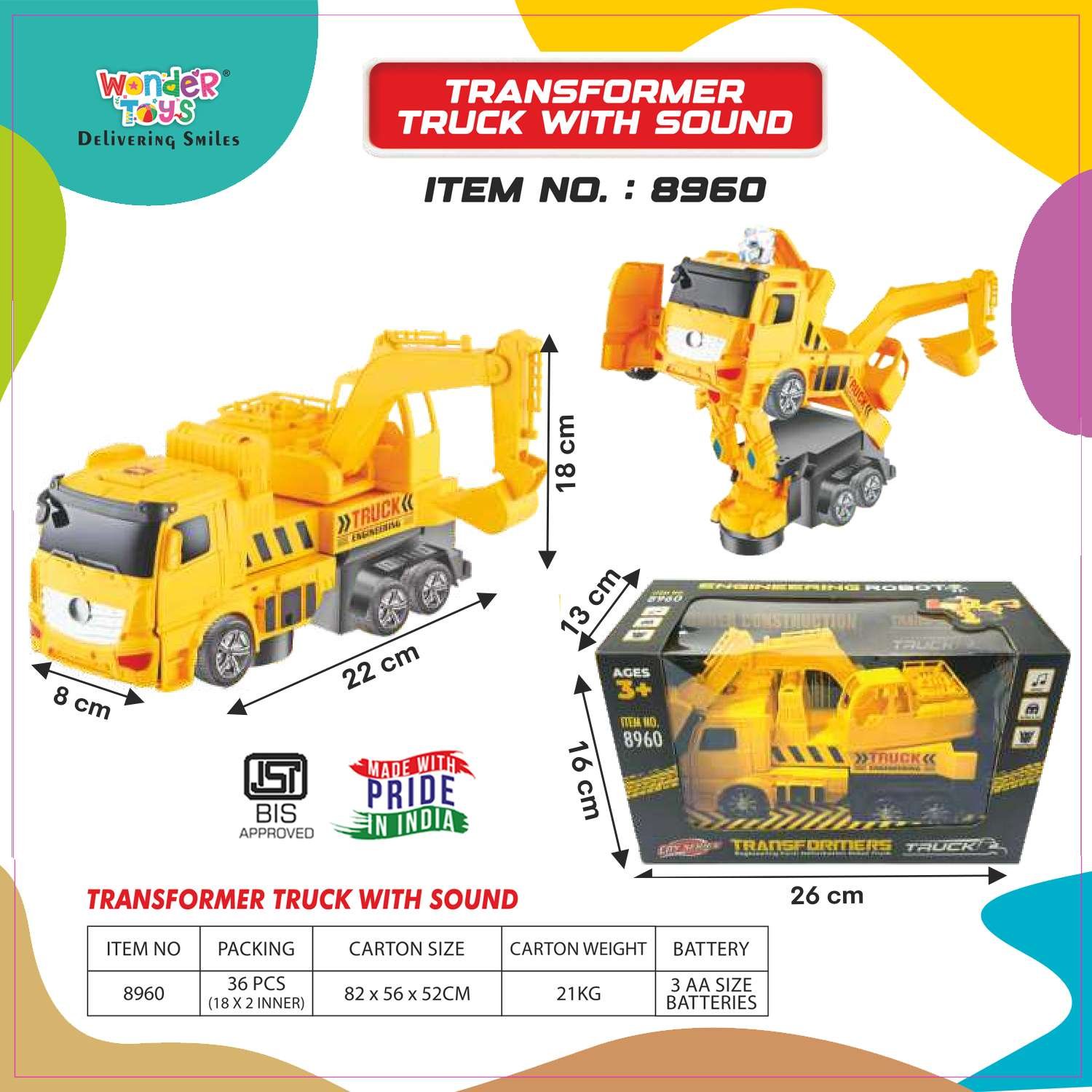 Delivered on 19 December at .The Transformer Truck With Sound by Wonder Toys is an interactive vehicle toy designed to provide endless fun for children. This toy features realistic sound effects that activate during play, giving kids a lifelike experience of a transforming truck in action.