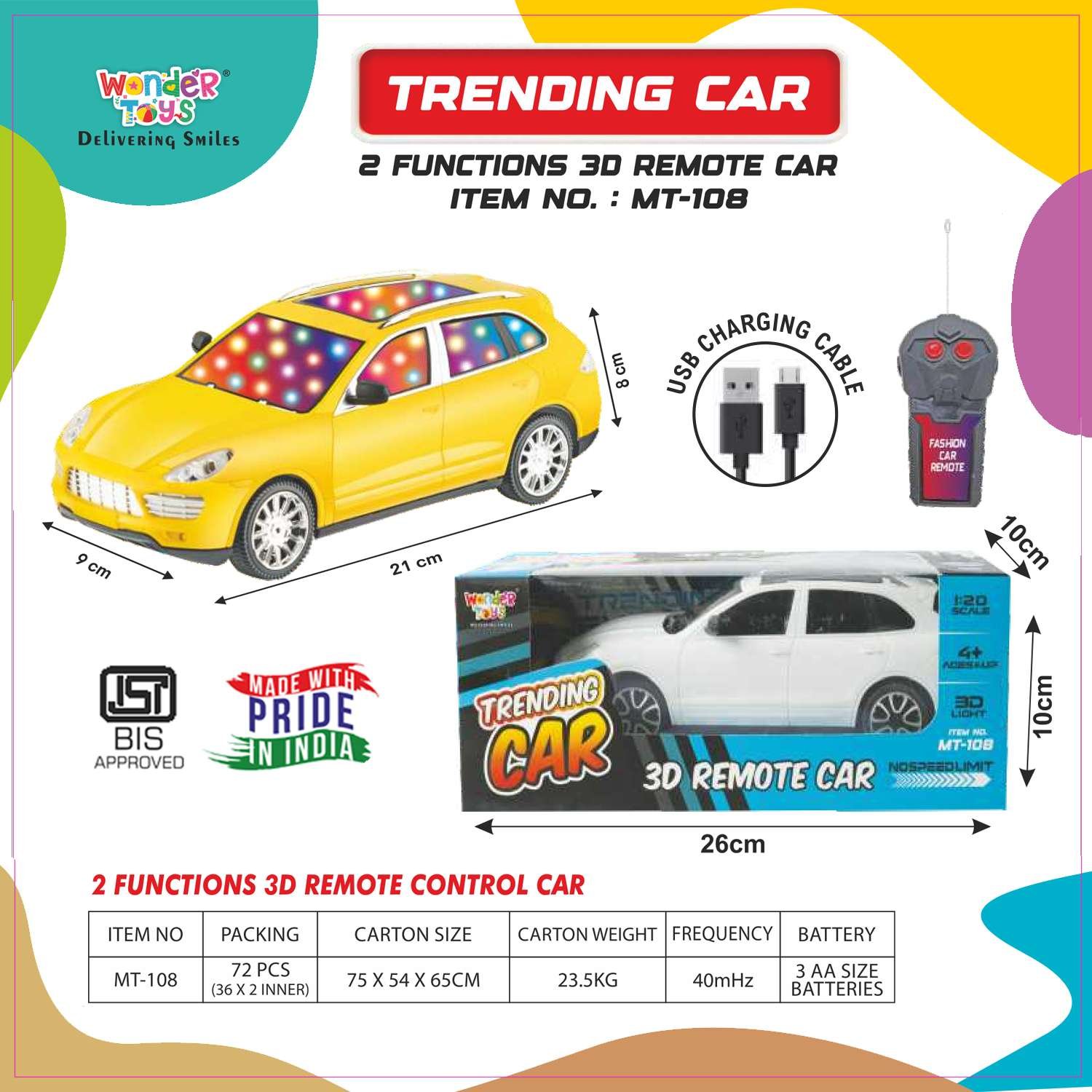 Delivered on 19 December at .The Trending Car 2 Functions 3D Remote Control Car is a premium toy from Wonder Toys, designed to provide children with a thrilling and safe play experience. Perfect for kids who love cars and remote-controlled toys, this car features two simple functions, allowing easy forward and backward movement.